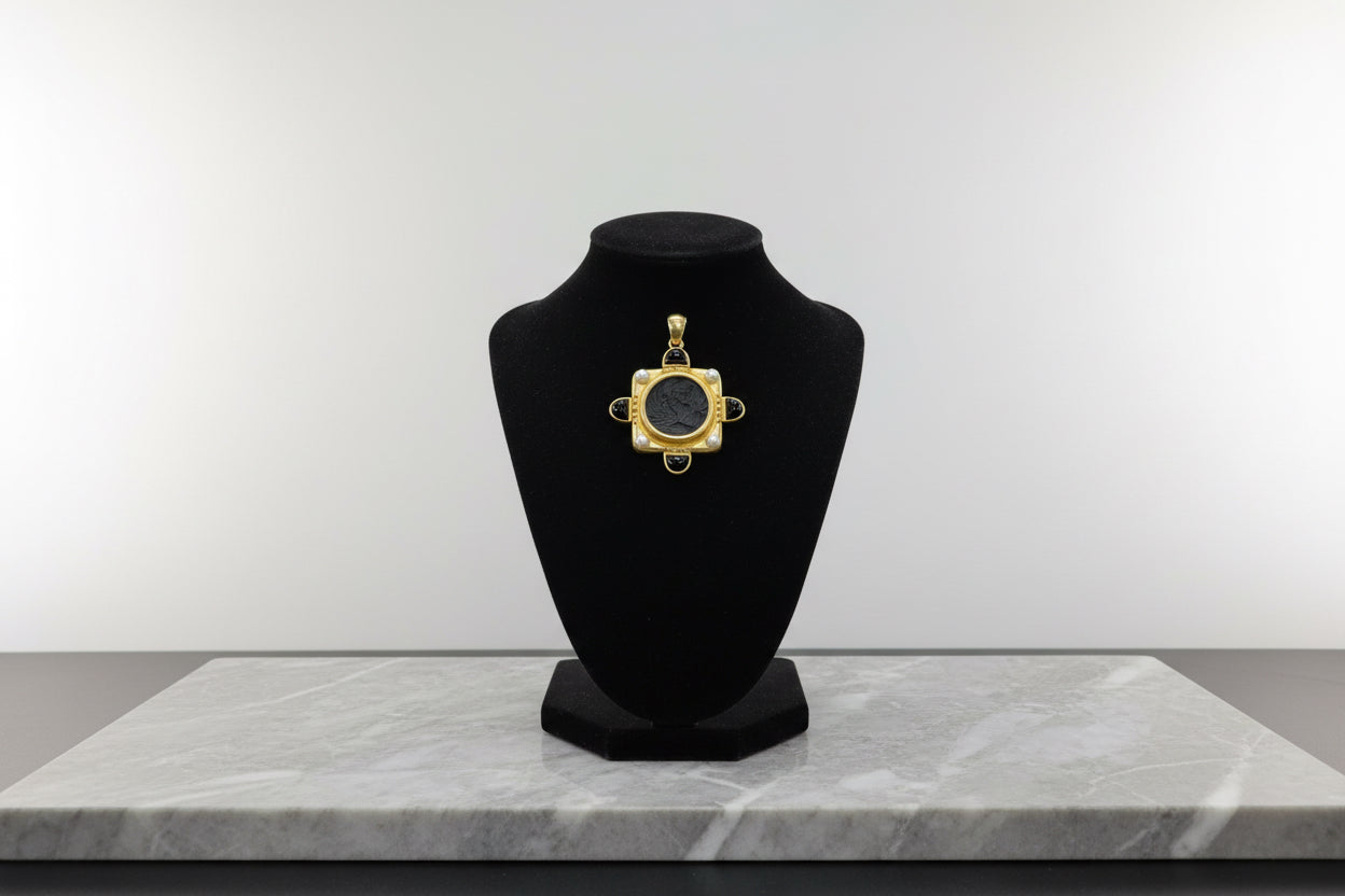 Elizabeth Locke Brooch/Pendant, 4 Cultured Pearls, 4 Onyx Cabochon, 1 Carved Onyx, 18K Yellow Gold 34.83g. All Weights Estimated