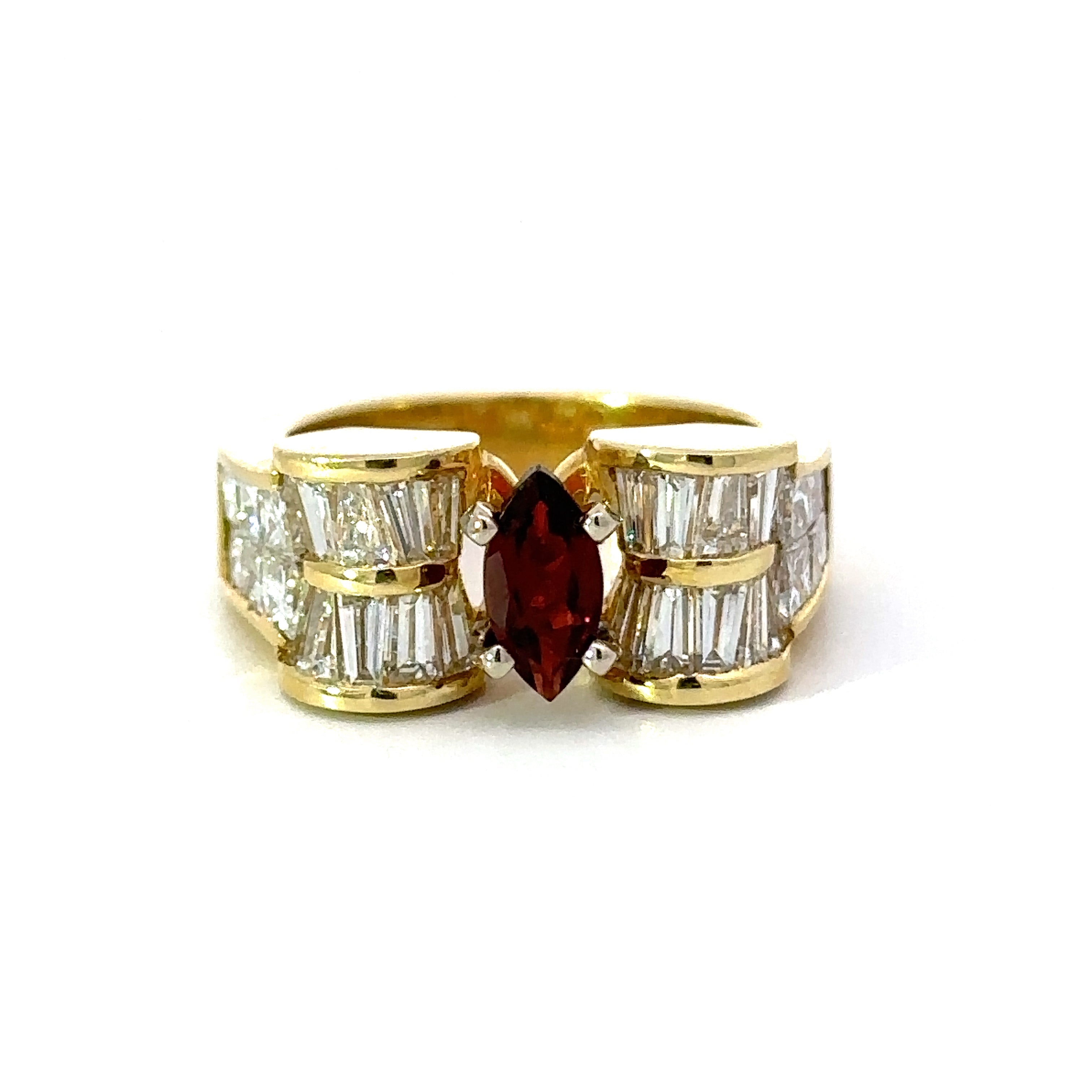 EMJ Ring, 1 Marquise Cut Garnet 0.70 ct, Mixed Cut Diamond 2.47 cttw F-G VS1-SI1, 14K Yellow Gold 10.95g