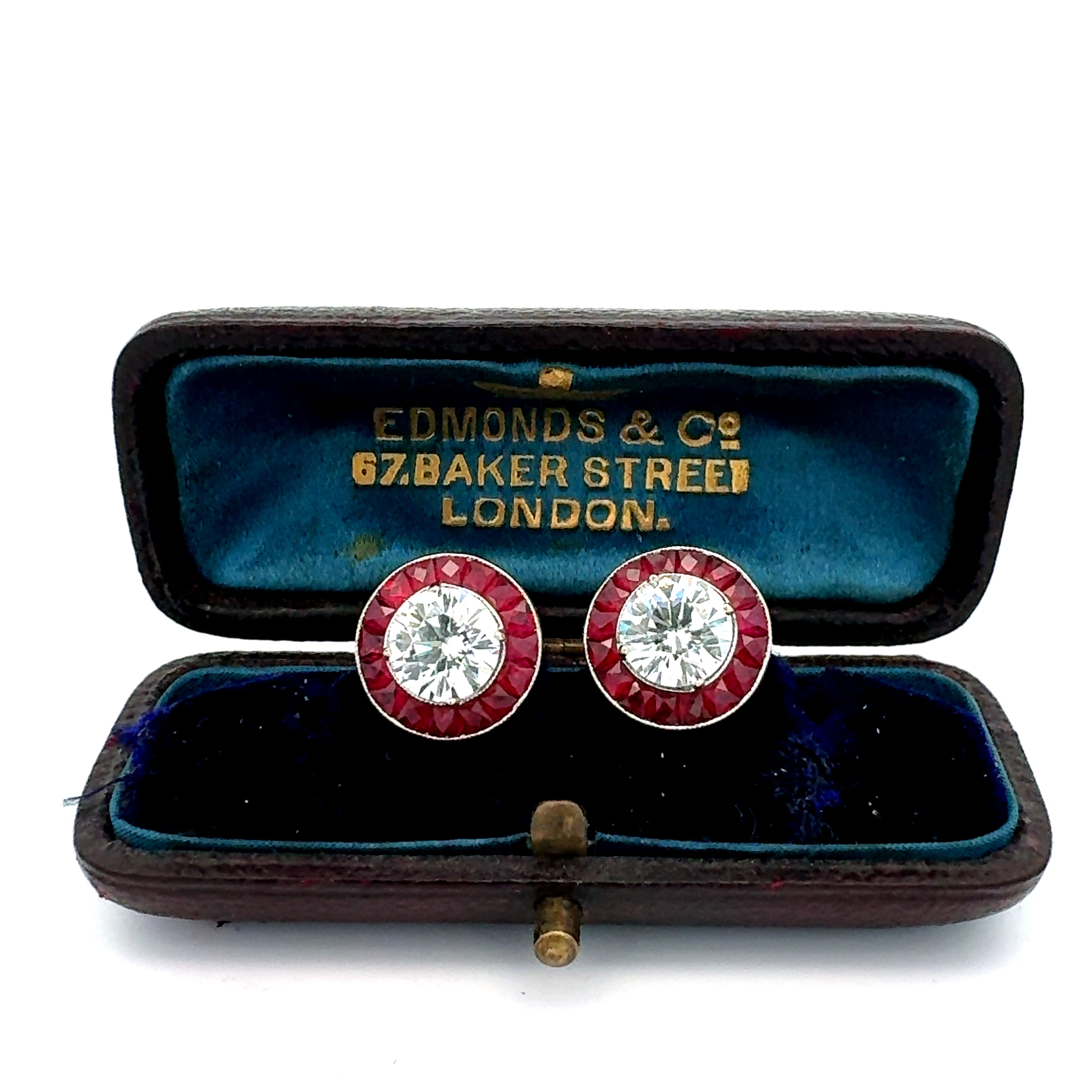 Art Deco Reproduction Aristocrat Earrings, 2 Round Cubic Zirconia, 32 Ruby 1.83 cttw, 18K White Gold 3.30g