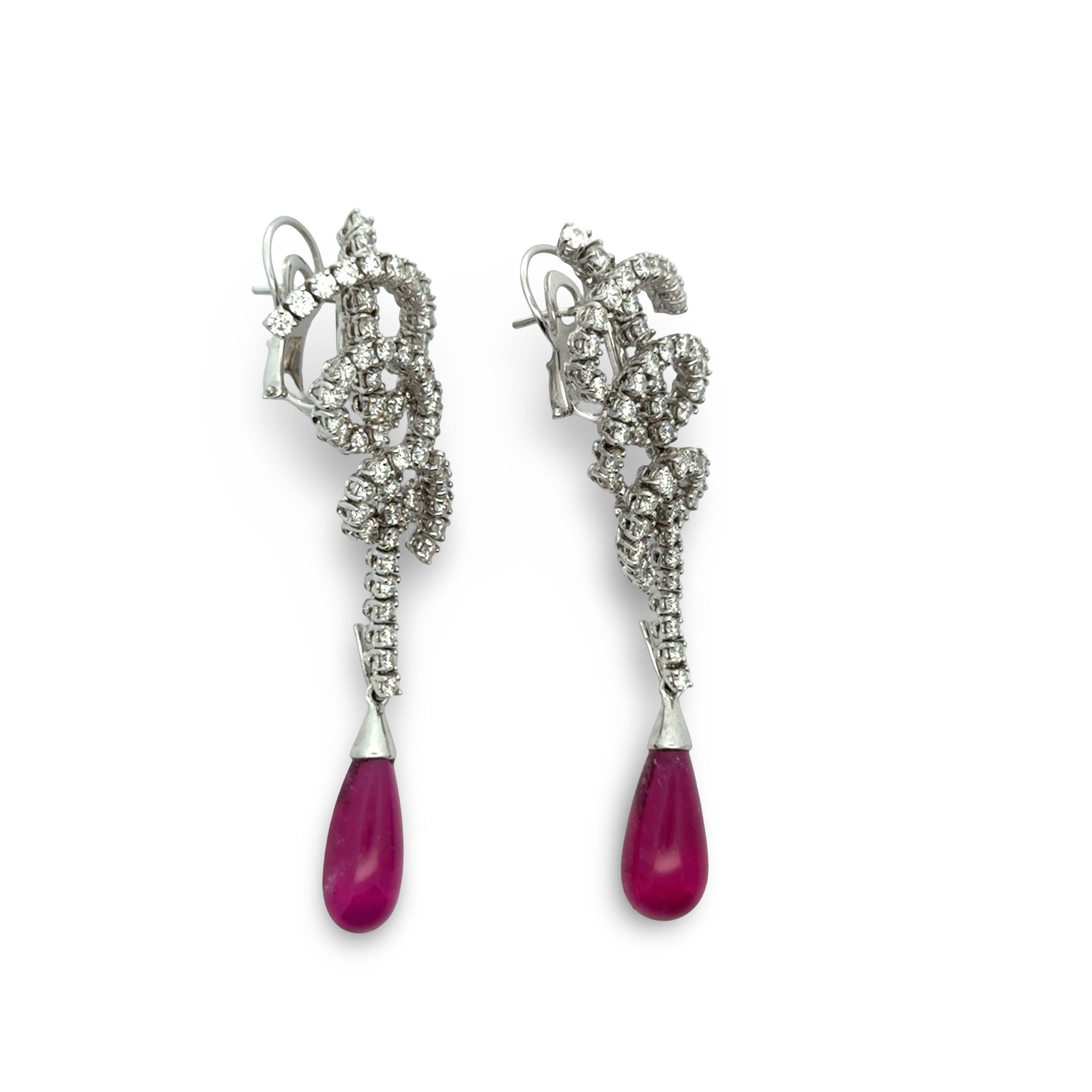 Bergio Earrings, 112 Round Brilliant Cut Diamond 4.27 ct G-H VS1-VS2,2 Rubellite Cabochon 5.40 ct 18K` White Gold