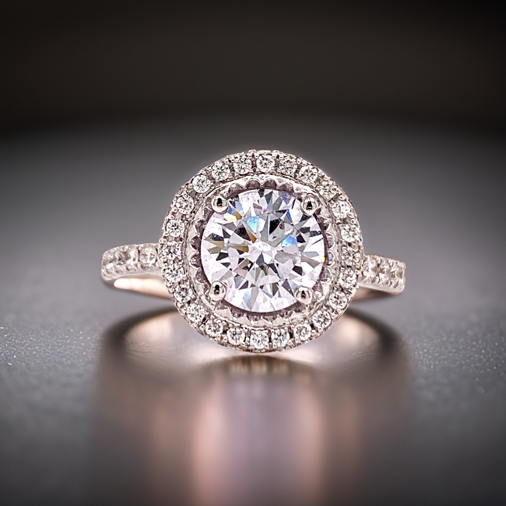 Bev Semi Mount Ring, 1 Round Cubic Zirconia, Round Diamond 0.90 cttw, 18K White Gold 5.56g (Center Holds 7.50 mm Round Stone)
