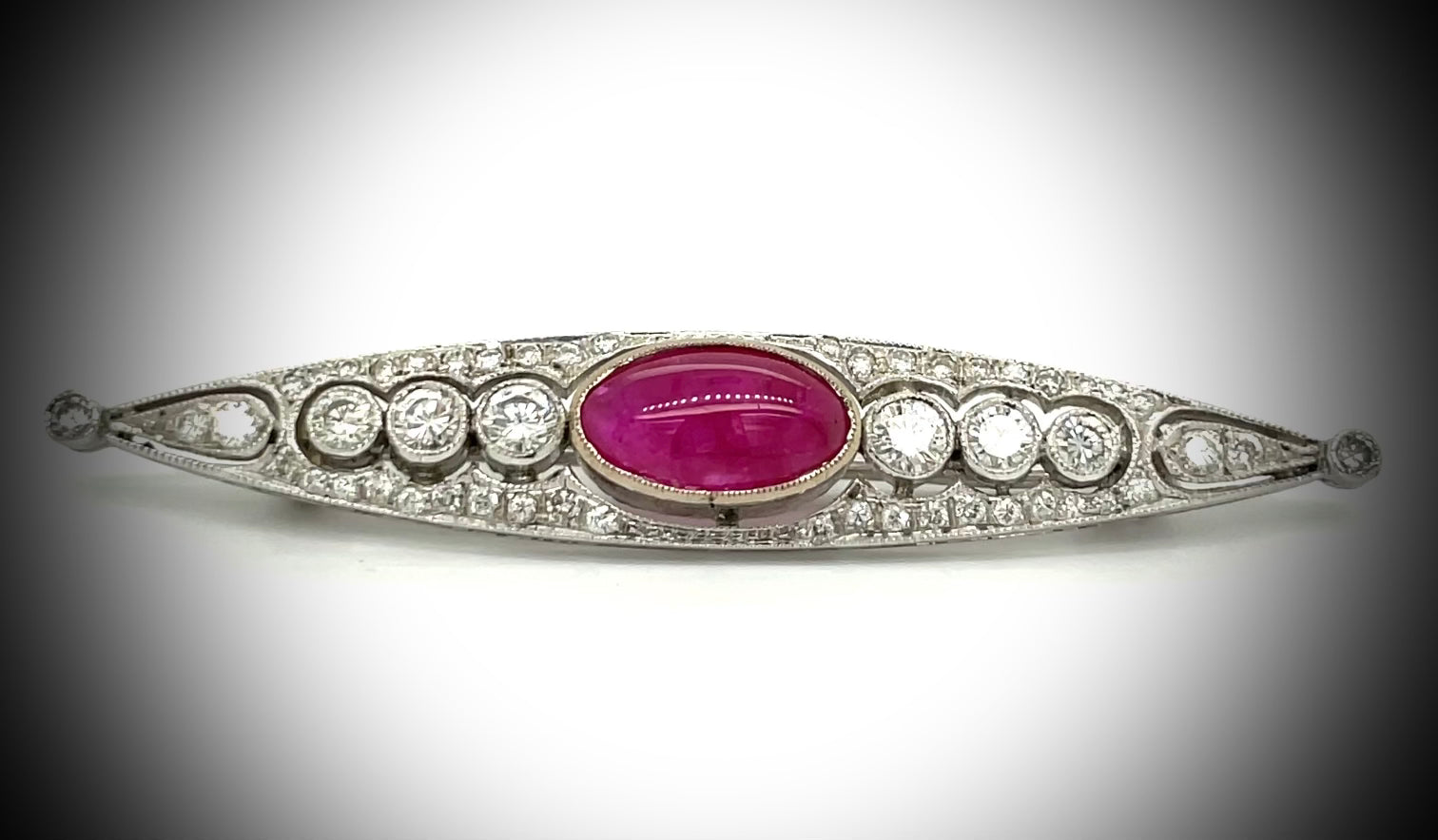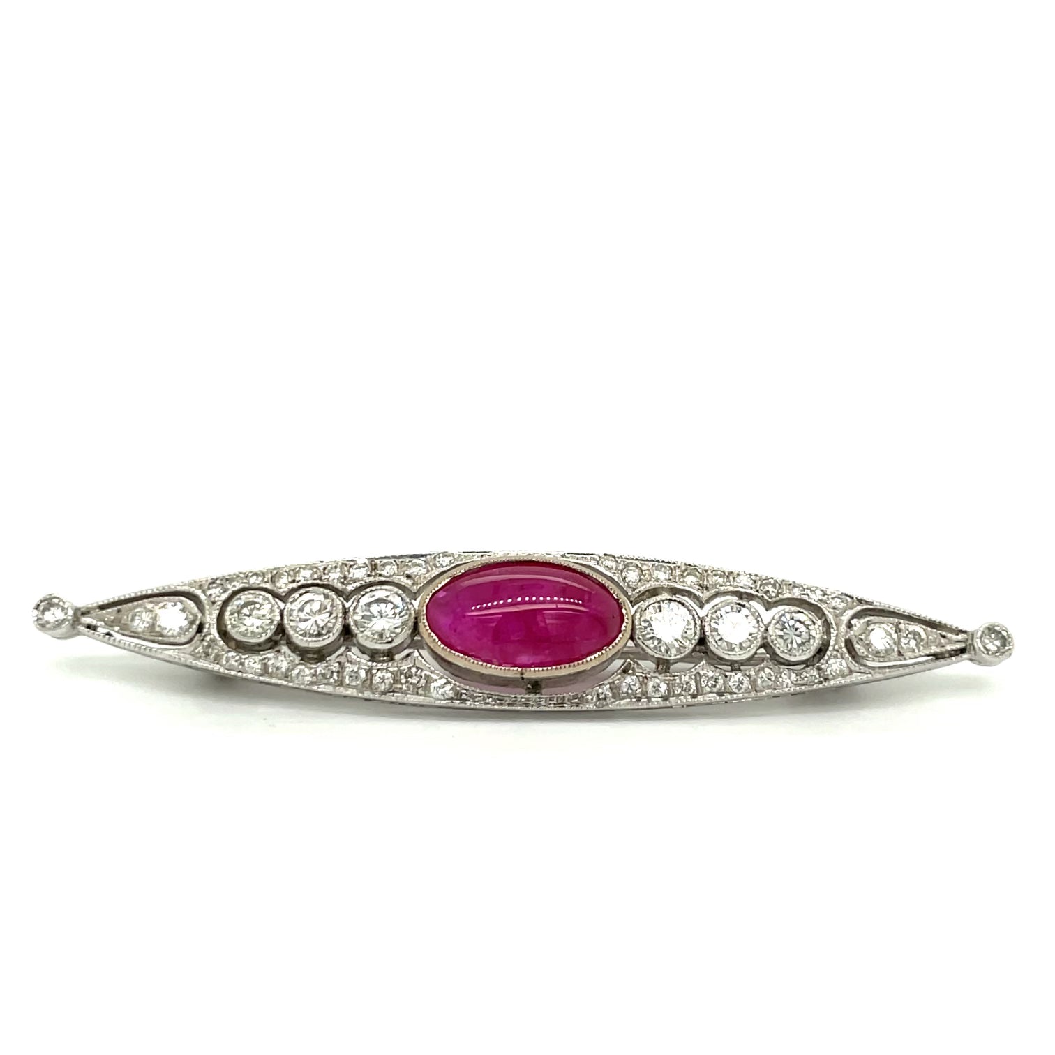Estate Brooch, 1 Oval Cabochon Ruby 1.60 ct, Round Diamond 2.00 cttw G-H VS1-SI1, 14K White Gold 3.54g