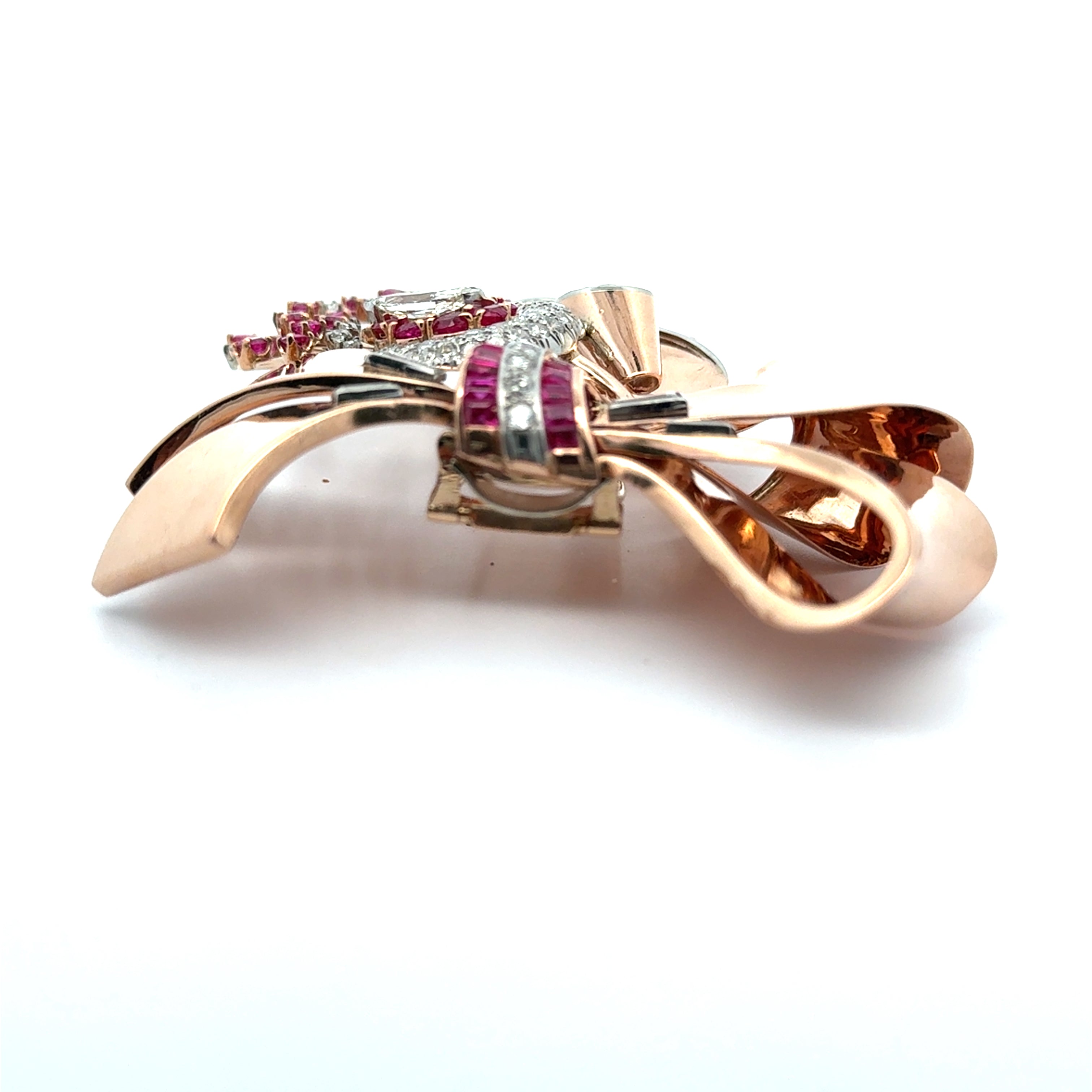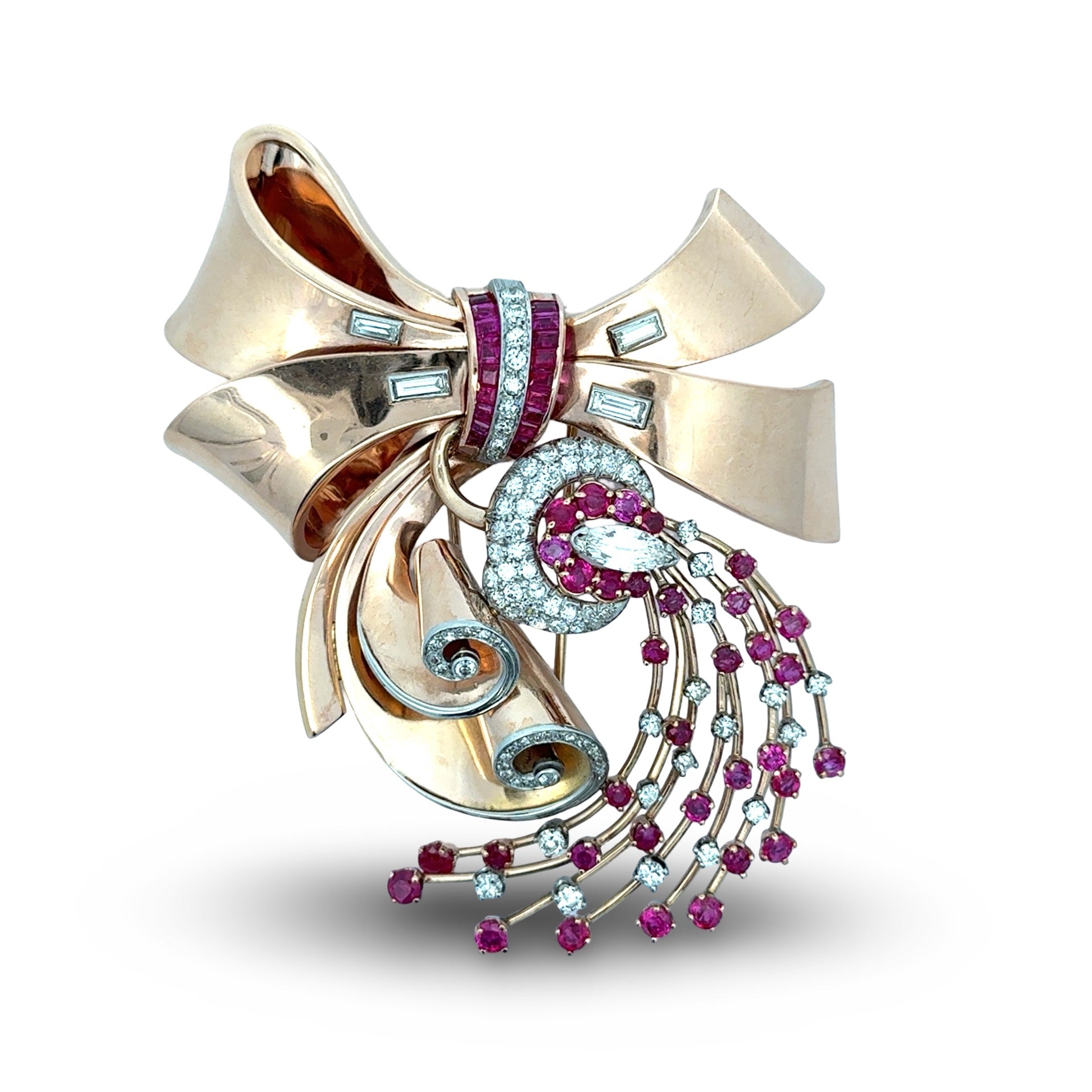 Estate Brooch/Pendant, 1 Marquise Cut Diamond 1.65ct K-VS2, Round/Baguette Cut Diamonds 4.05ctttw H-L VS2-SI1, Ruby French Cut 5.00ct Red-Dark Pink, 14K Rose Gold 55.12g