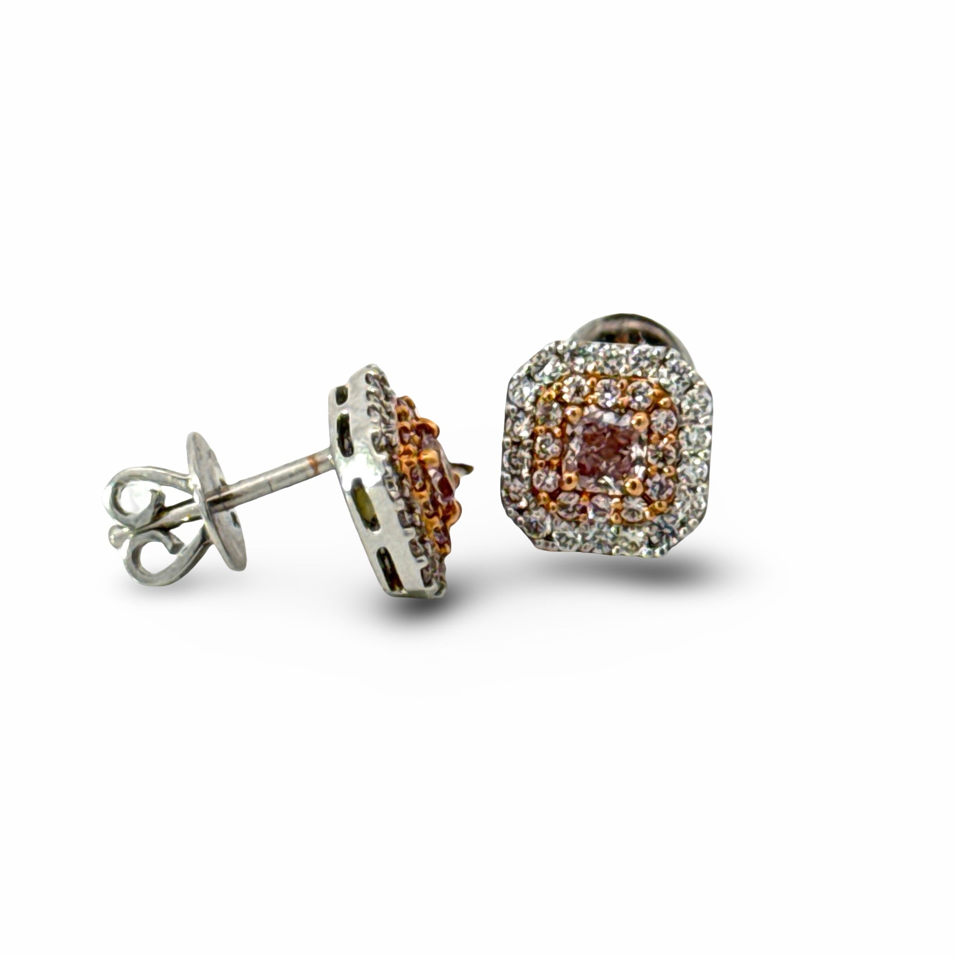 Estate Earrings, 2 Cushion Modified Diamonds 0.34cttw Nat Light-Fancy Pink VS2-SI1, 24 Round Brilliant Cut Diamond 0.44cttw Nat. Light-Fancy Pink VS2, 36 Round Brilliant Cut Diamonds 0.31cttw G-H VS2-SI1, 18K...