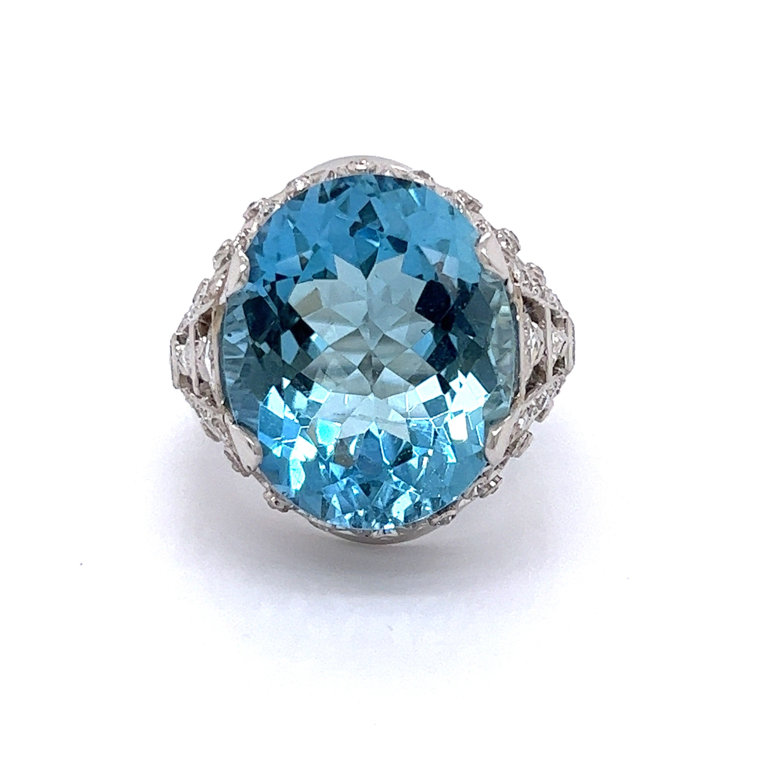 Estate Traditional Ring, 1 Oval Aquamarine 16.83ct, Round/Trillion Diamond 1.10 cttw I-J SI1, Platinum 17.41g
