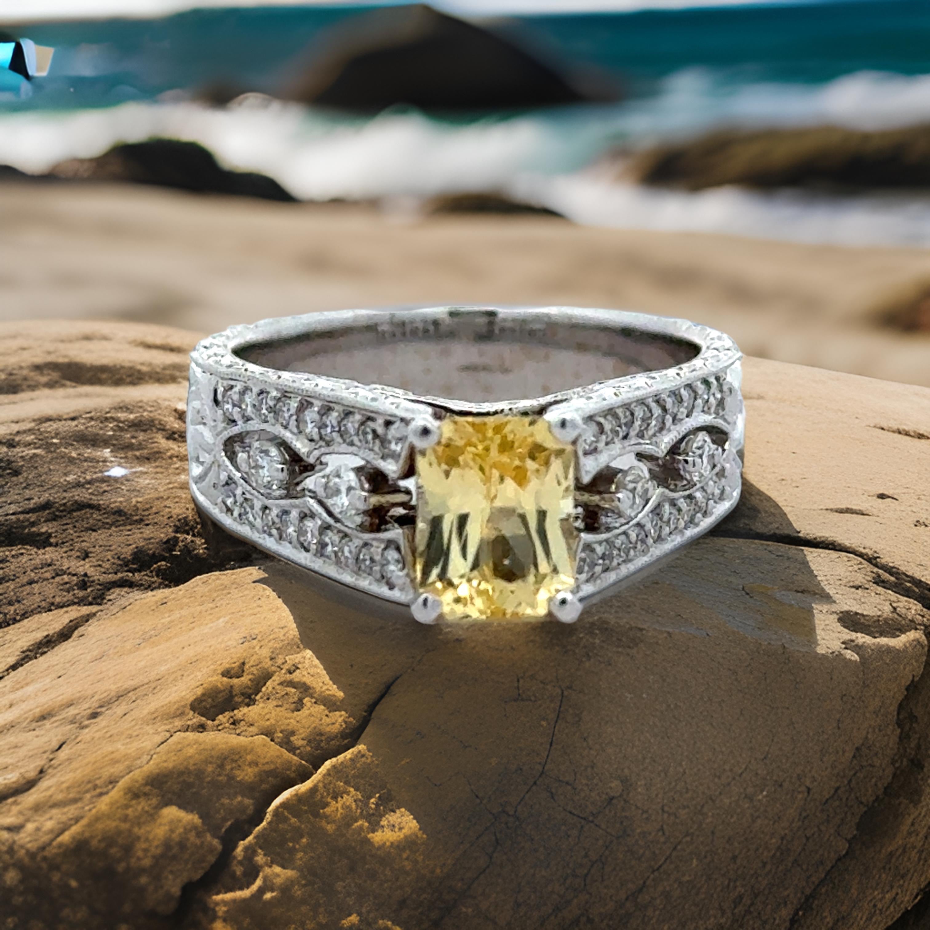 Estate Ring, 1 Emerald Cut Yellow Sapphire 1.32 ct, 40 Round.Diamond G-H SI1-SI2 0.32 cttw, 18K White Gold 7.93g. Size 6.5