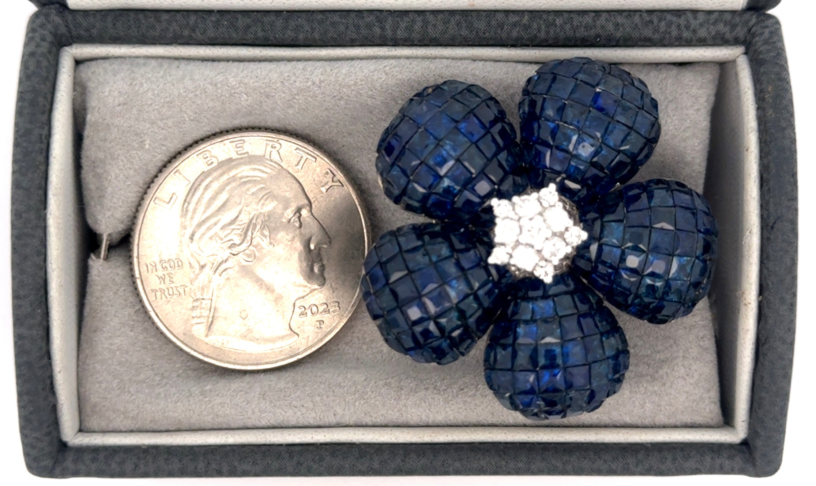Estate Ring, French Cut Sapphire 14.50 cttw Invisible Set, 11 Round Brilliant Cut Diamond 0.40 cttw G-H SI1-SI2, 18K White Gold 24.90g