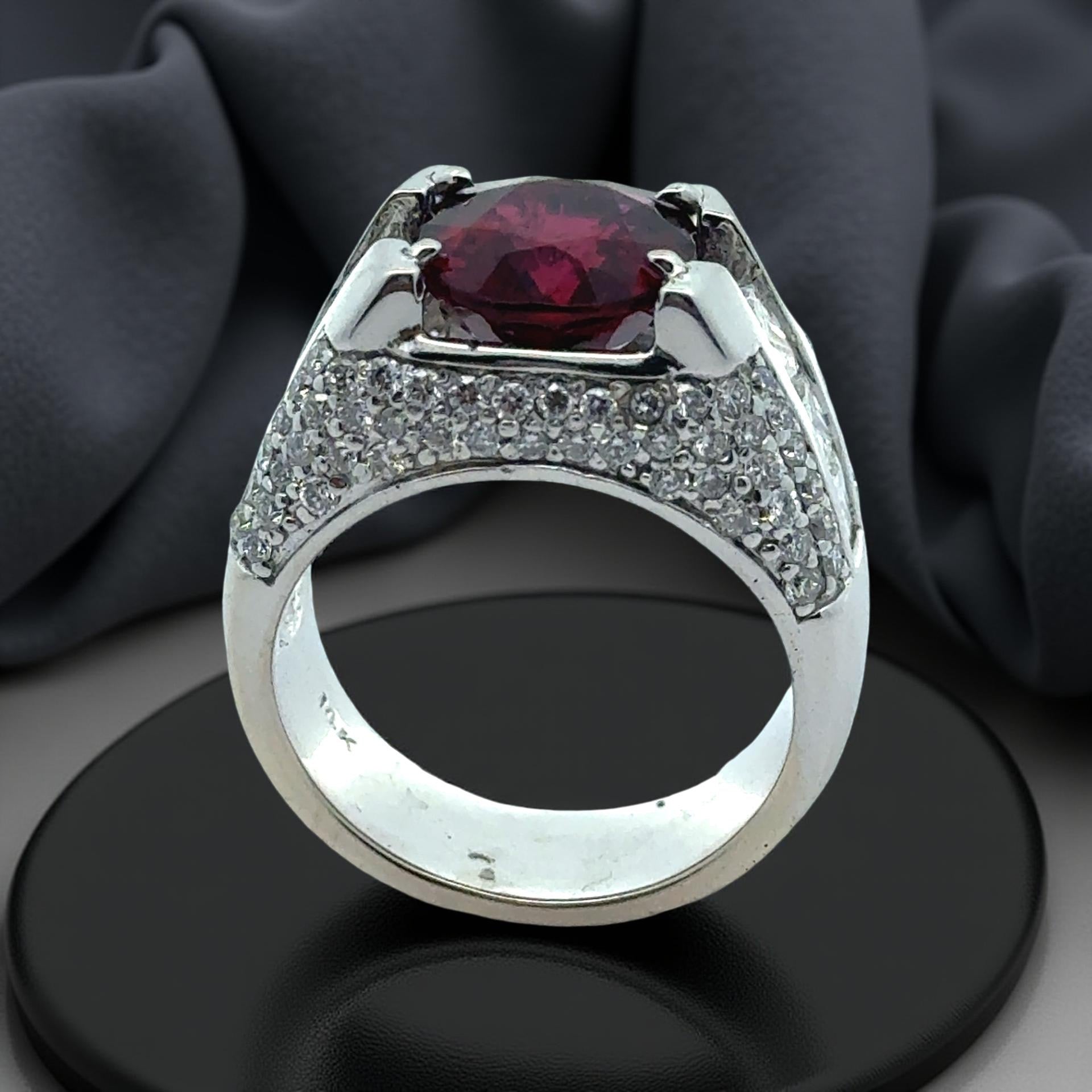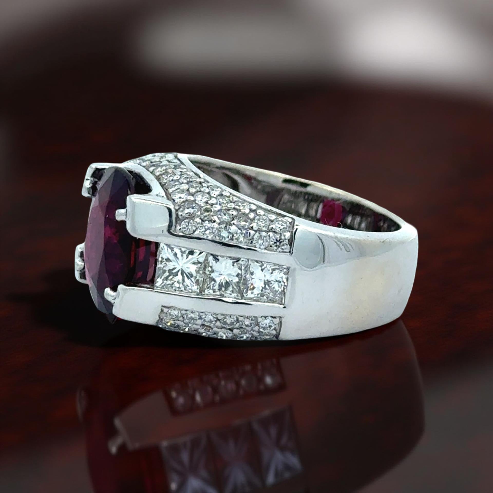 Estate Ring, 1 Rubellite Oval 4.29 ct, Round Brilliant Cut Diamond 1.08 cttw G-H VS1-VS2, Princess Cut Diamond 1.34 cttw G-H VS1-VS2, 14K White Gold 12.69g. Size 6.75