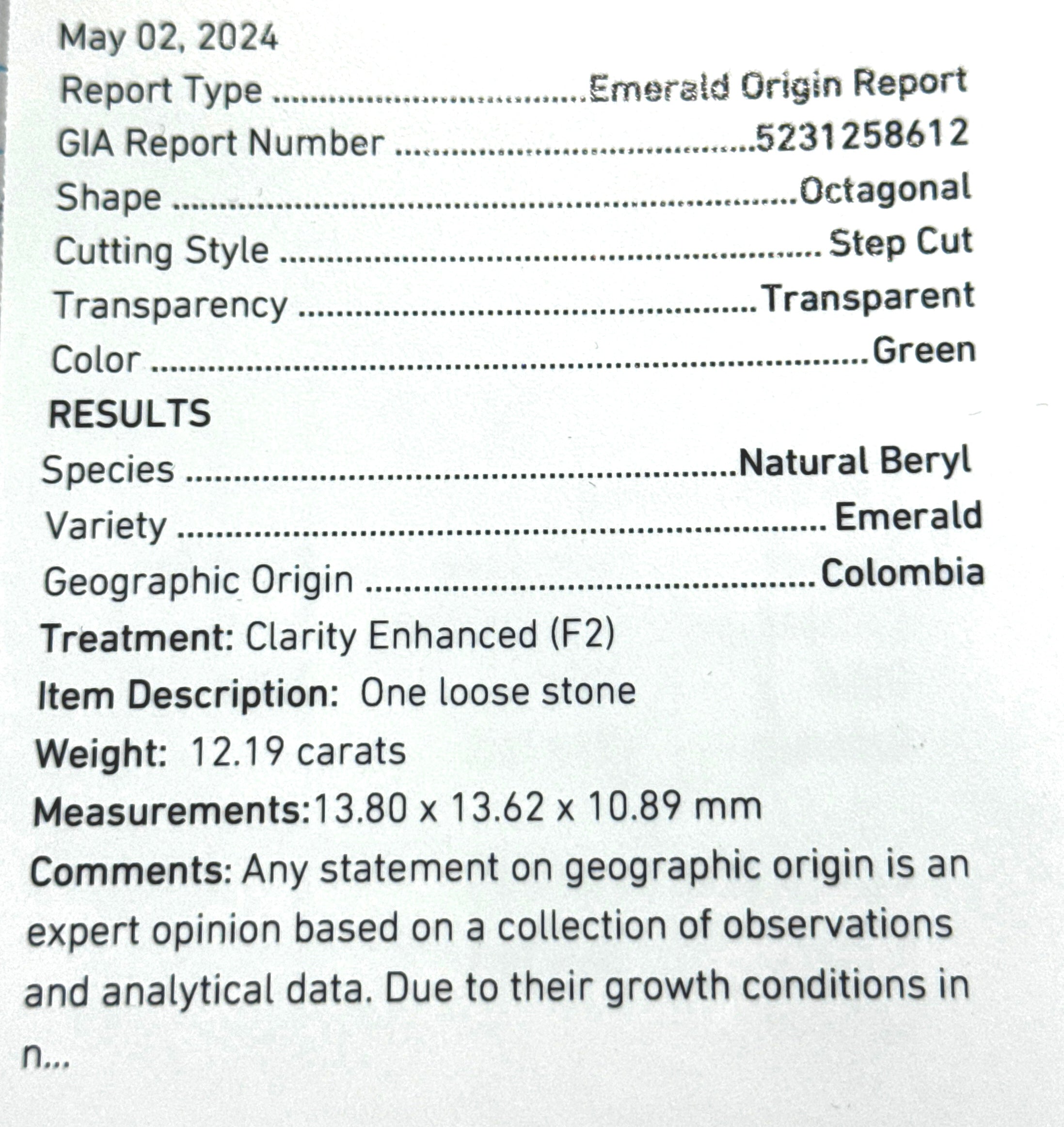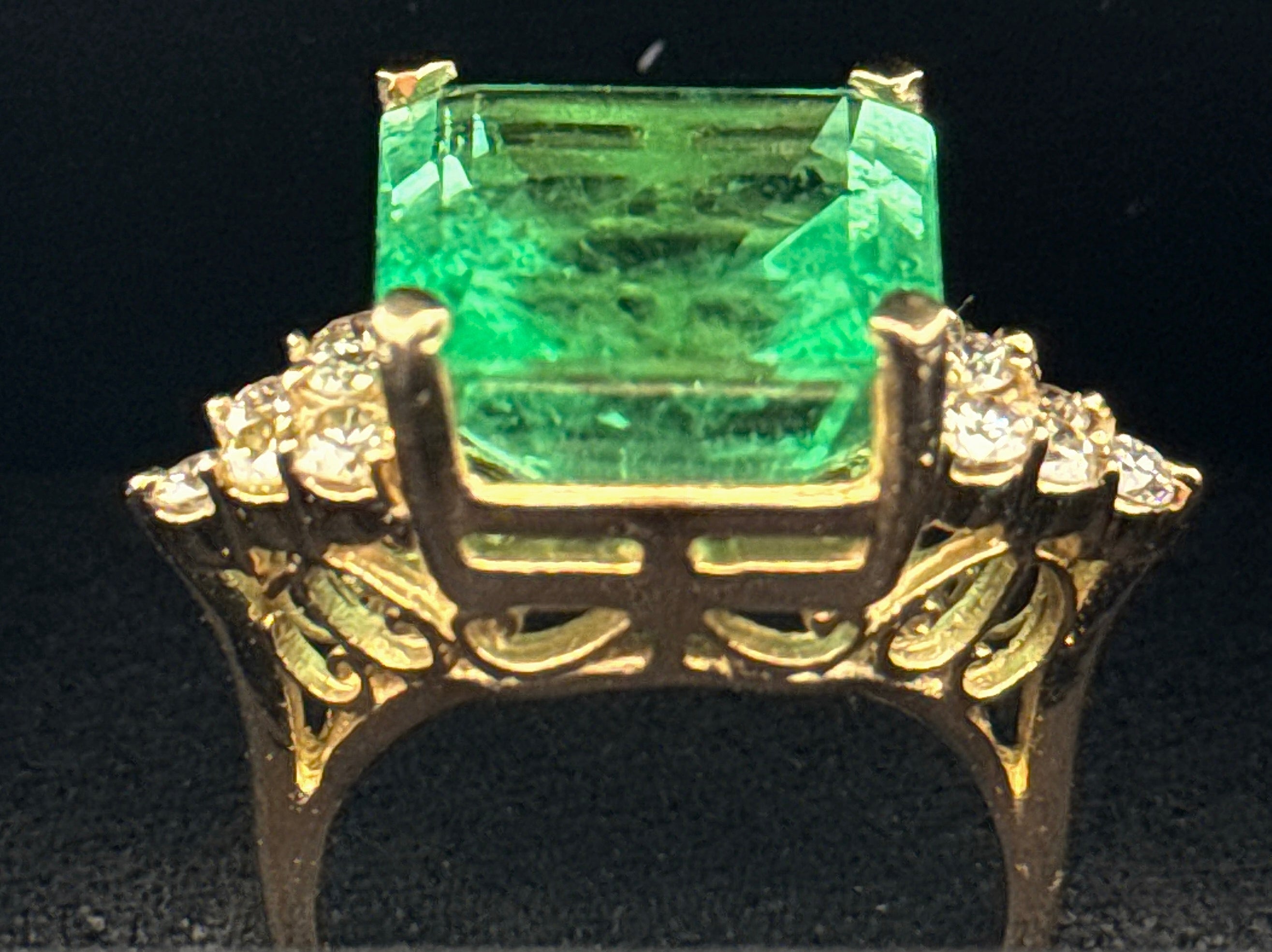 Estate Ring, 1 Step Cut Colombia Emerald 12.19 ct GIA #523125861212 (Original), 12 Round Brilliant Cut Diamond 1.20 cttw G-H VS2-SI1, 14K Yellow Gold 6.62g. Size 6.75