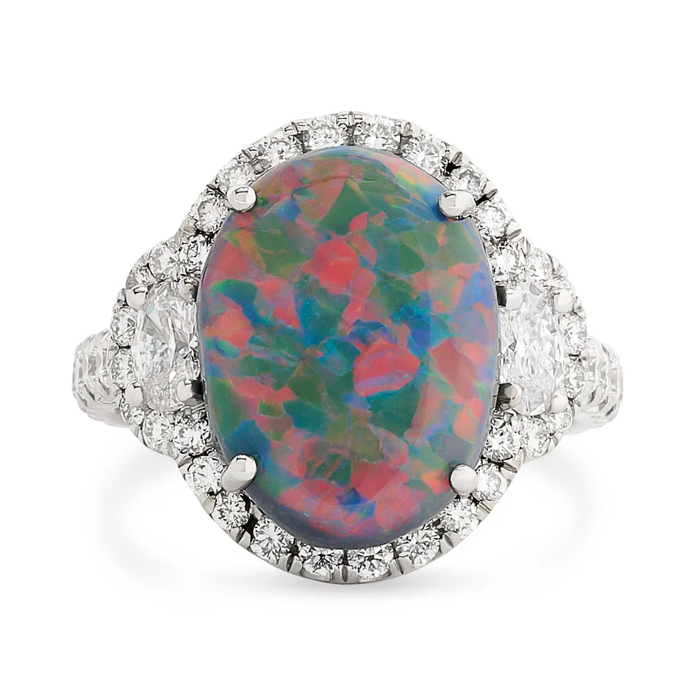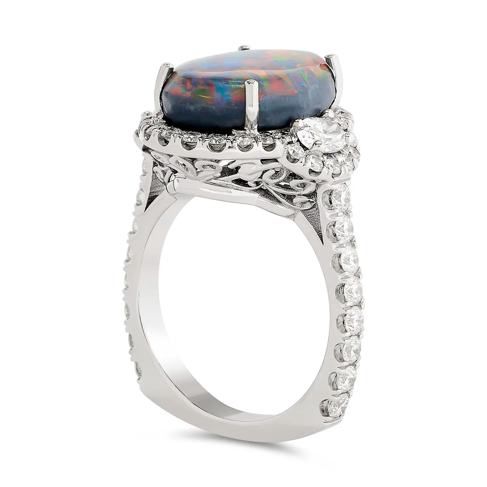 Estate Ring, 2 Oval Diamonds 0.40cttw G-H VS2-SI1, 48 Round Brilliant Cut Diamonds 1.00cttw, 1 Opal 5.01ct Black, 18K White Gold 7.53g. Weights estimated.