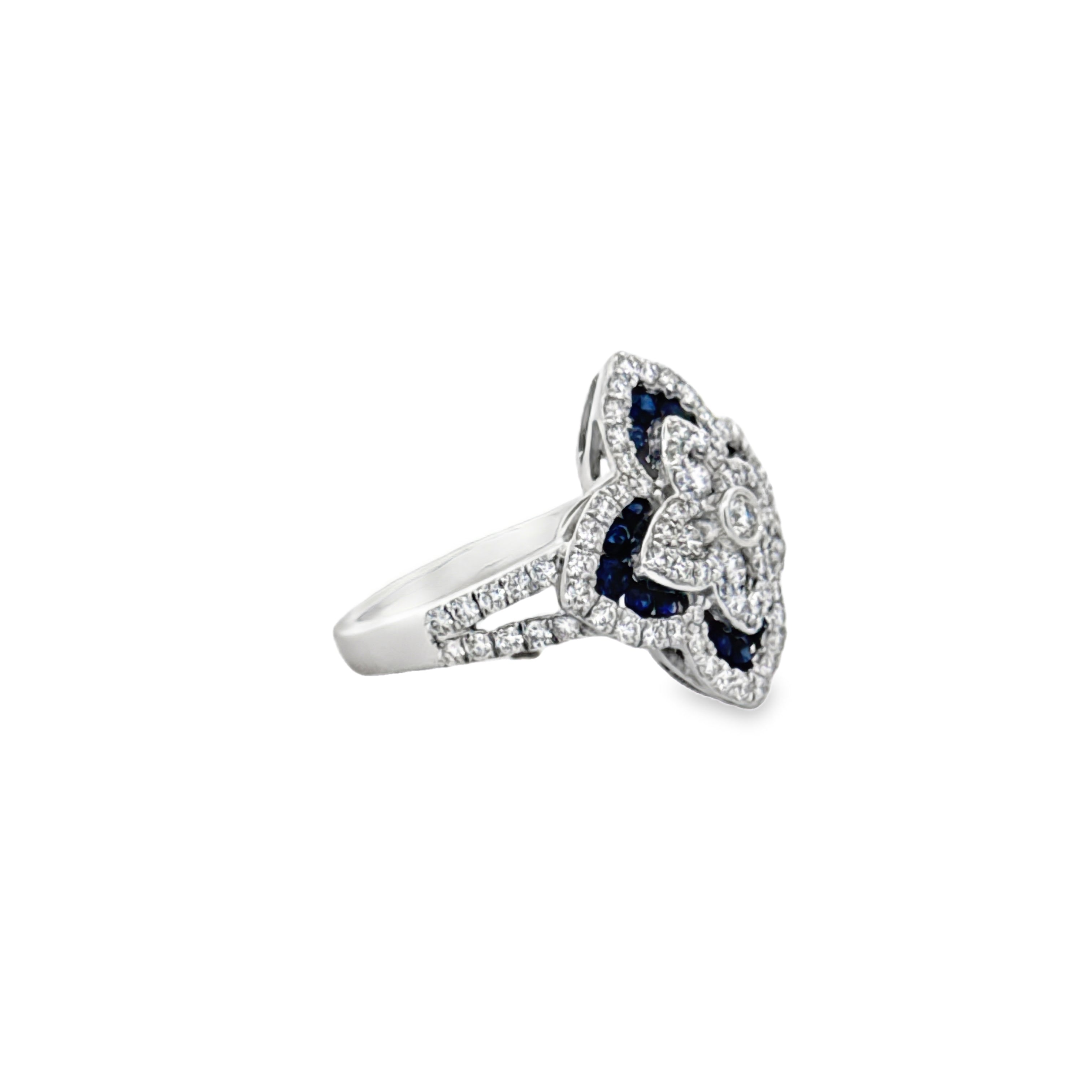 Estate Ring, 89 Round Brilliant Cut Diamonds 1.01cttw G-H VS2-SI1, 20 Sapphire Round Brilliant Cut 0.55cttw Fine Blue, 14K White Gold 5.45g. All Weights Estimated.