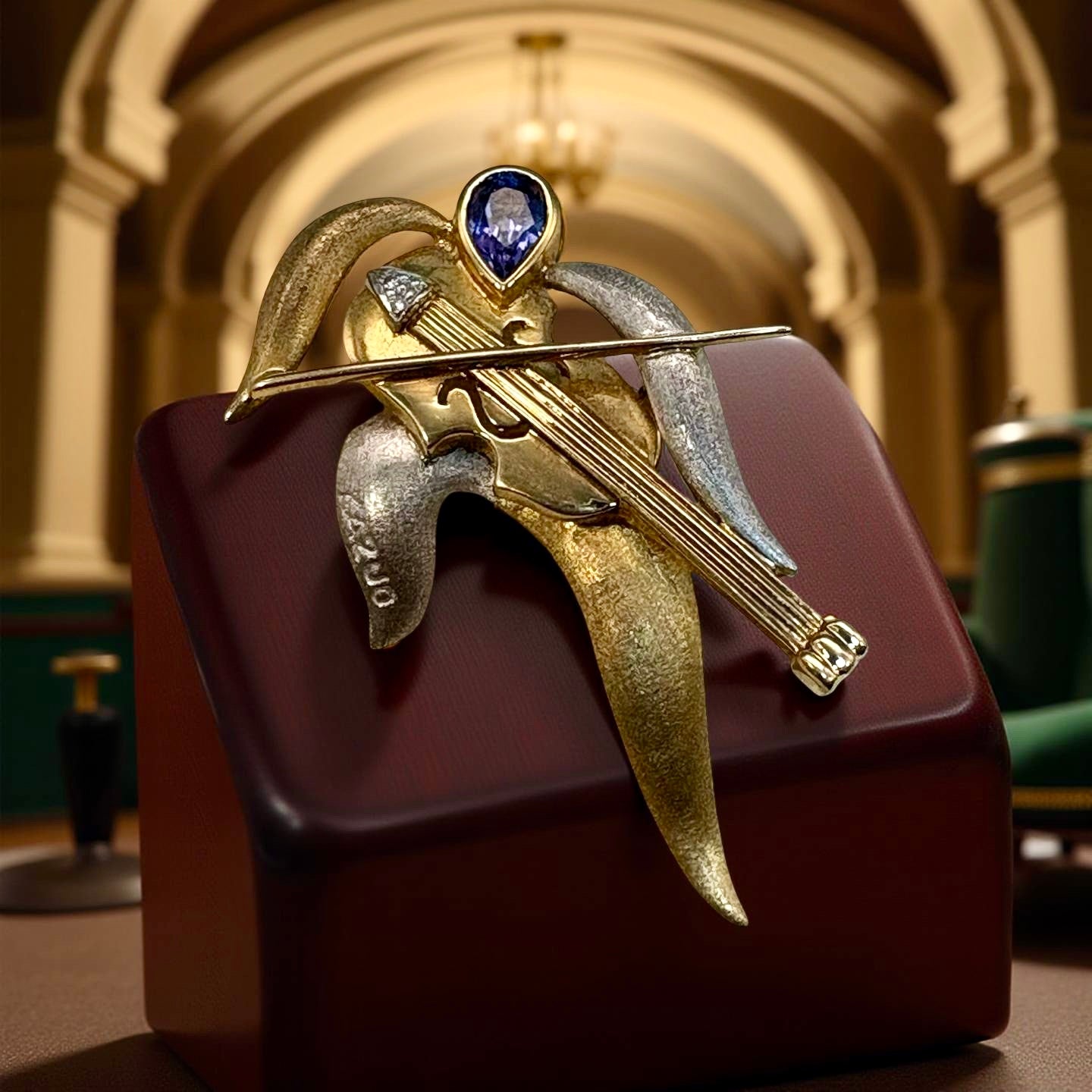 Kazuo Ogana Brooch/Pendant, 3 Round Brilliant Cut Diamond 0.02cttw. G-H VS2-SI1,1 Tanzanite Pear Shape 0.33ct. Platinum/18K Yellow Gold 14.80g