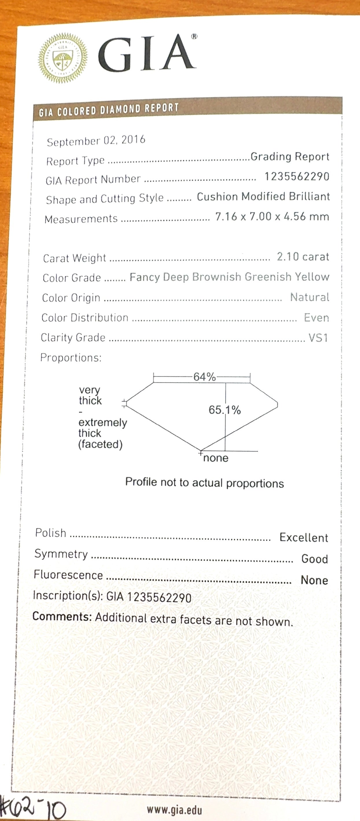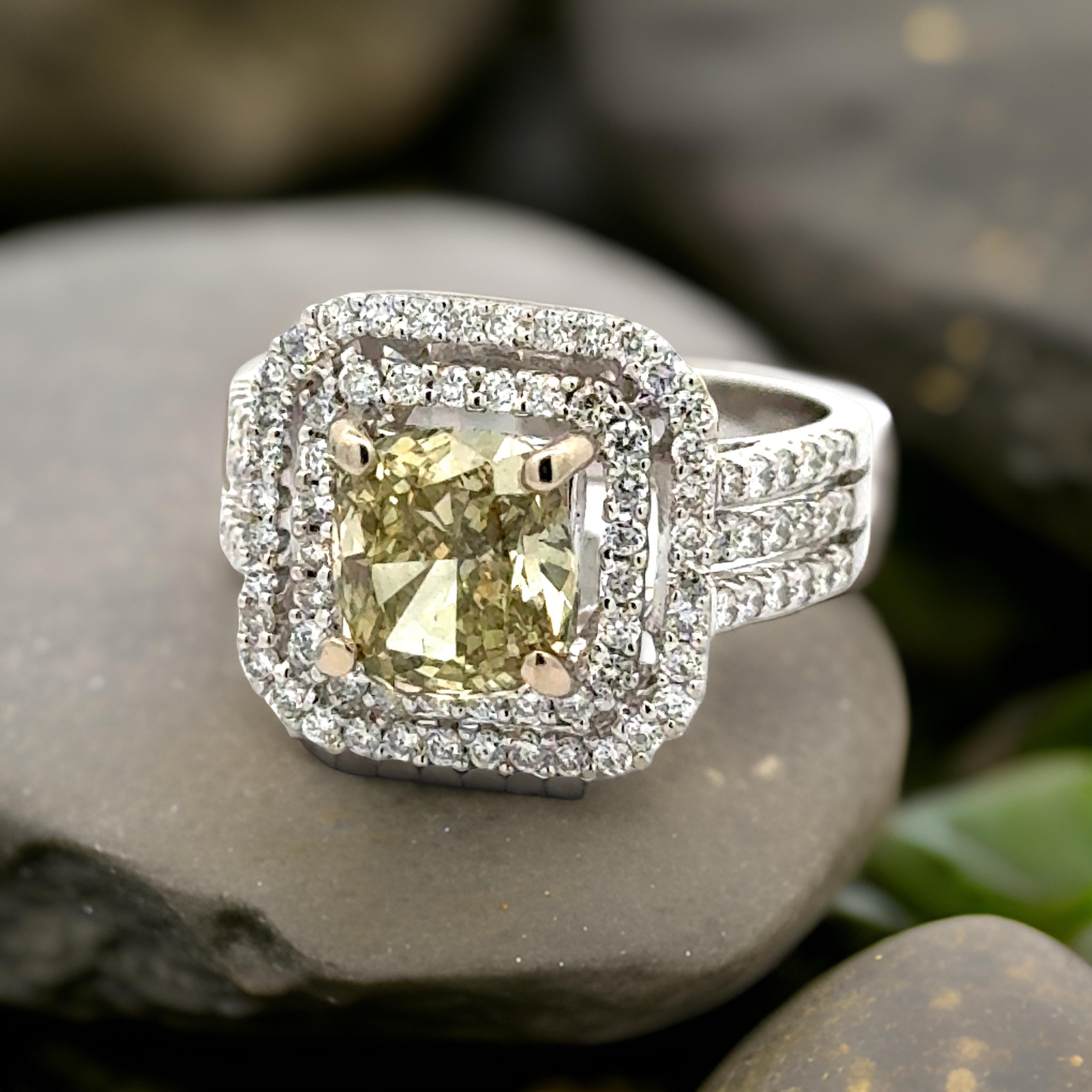Maya Lianna Double Halo Ring, 1 Cushion Modified Diamond 2.10ct GIA #1235562290 Fancy Deep Brownish Greenish Yellow VS1, 96 Round Diamond 0.81ct H-I SI1-SI2, 18K White Gold 7.57g (Original Cert)