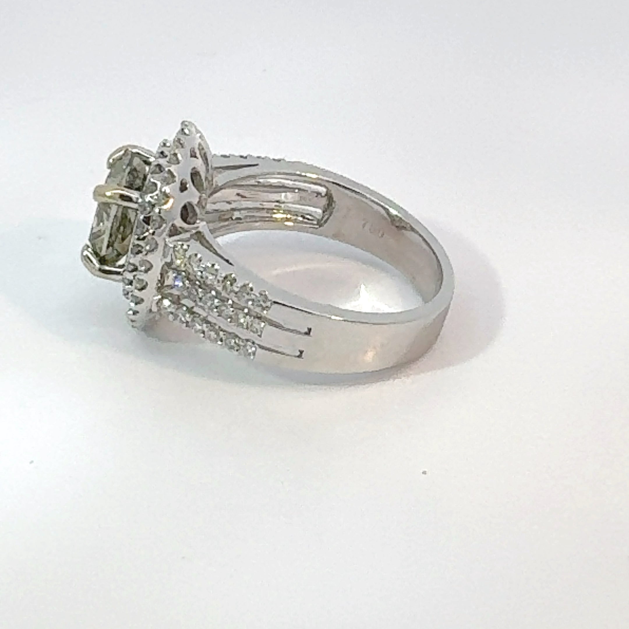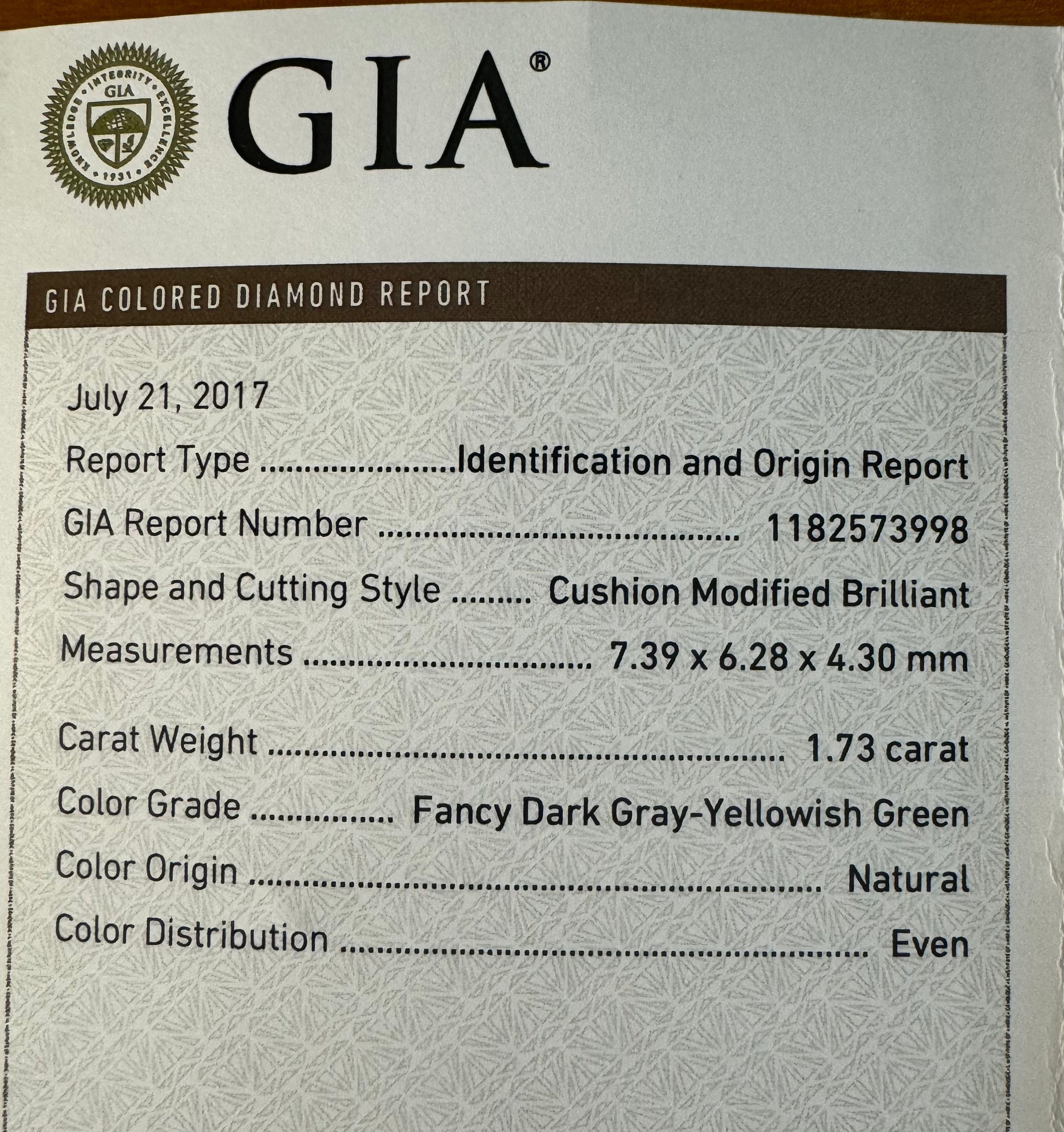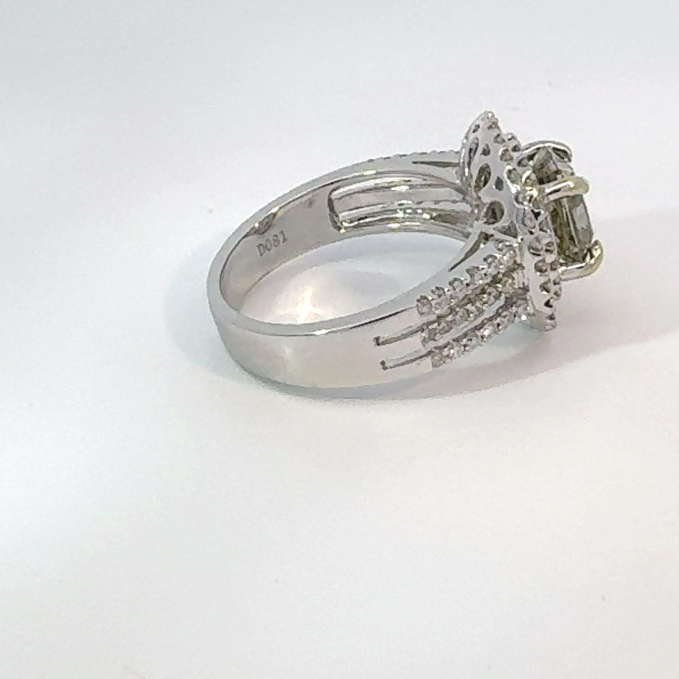 Maya Lianna Halo Ring, 1 Cushion Modified Diamond 1.73ct GIA #1182573998 Fancy Dark Grey-Yellowish Green I1 (clarity not on cert), 90 Round Diamond 0.81ct H-I SI1-SI2, 18K White Gold 5.90g (Original Cert)