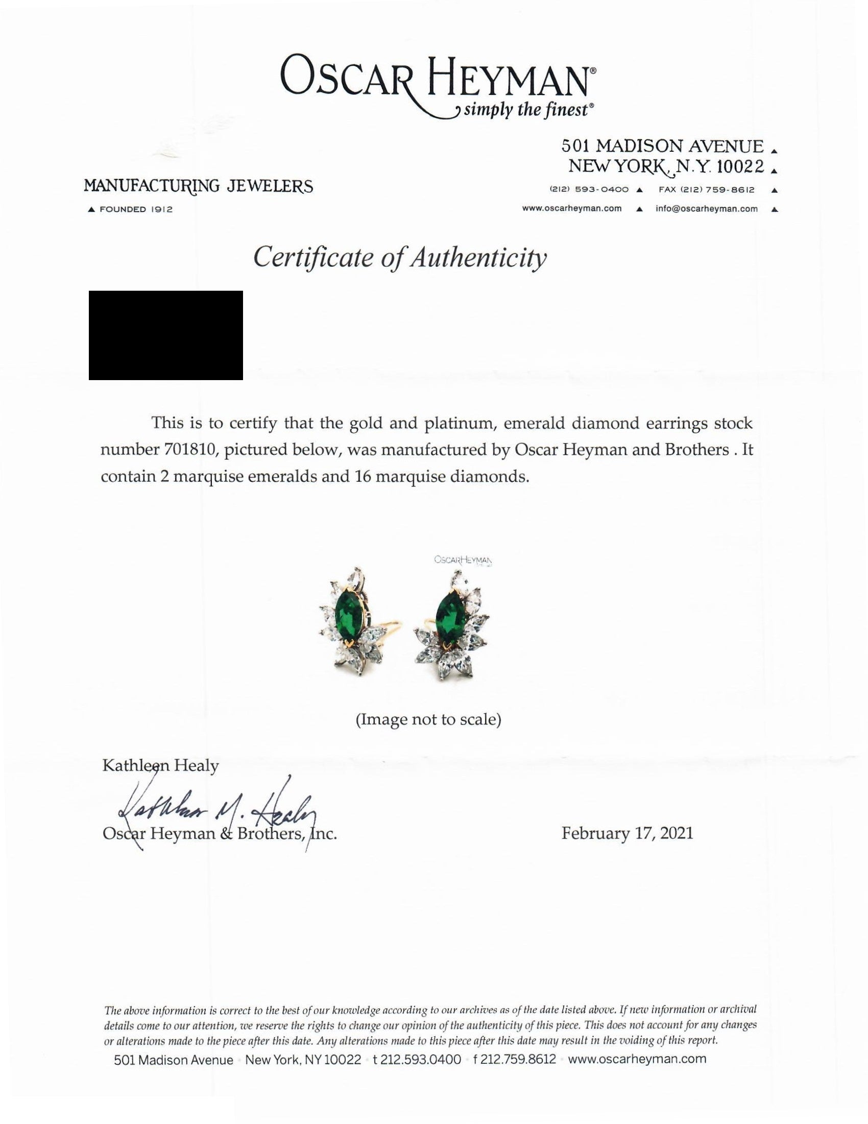 Oscar Heyman Earrings, 16 Marquise Cut Diamonds 4.06cttw E-F VS1-VS2, 2 Emeralds Marquise Cut 3.48cttw, 18K/PLAT Yellow Gold 10.00g. Weight estimated.